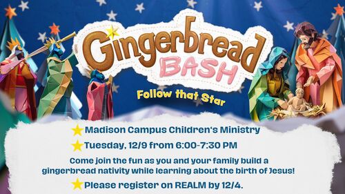 Join us Tuesday, Dec. 9 for the Gingerbread Bash! You and your family will learn about the first Christmas as we play games, sing songs, and build a nativity. Registration open Nov. 16, please register by Thursday, Dec. 4. Space is limited, so try to register early.