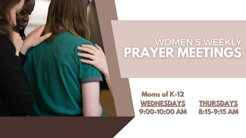 - Mom's Prayer Group (Kdg-12th): We will meet for prayer every Wednesday, beginning 9/3, from 9:00-10:00a.m., downstairs in the Student Ministry game room. Contacts: Jennifer Wade or Mary Clifford.