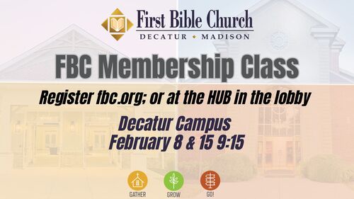 If you're interested in becoming a member of First Bible, a two part membership class will take place at the Decatur Campus, February 8 & 15.